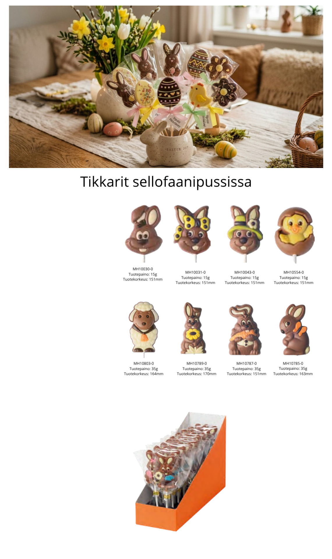 Värikkäitä taiteellisesti koristeltuja pääsiäisaiheisia tikkareita jotka on valmistettu korkealaatuisesta maitosuklaasta. Tikkareiden paino vaihtelee 15g - 35 g ja välillä ja korkeus 150mm -165mm välillä. Tuotteet on pakattu sellofaanipussiin.