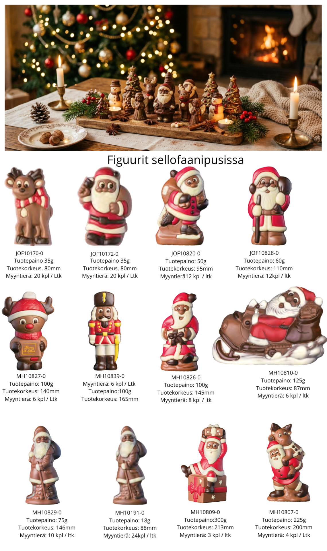 Värikkäitä taiteellisesti koristeltuja jouluaiheisia hahmoja jotka on valmistettu korkealaatuisesta maitosuklaasta. Figuurien paino vaihtelee 30g -300 g välillä ja korkeus 80mm - 210mm välillä. Tuotteet on pakattu sellofaanipussiin.